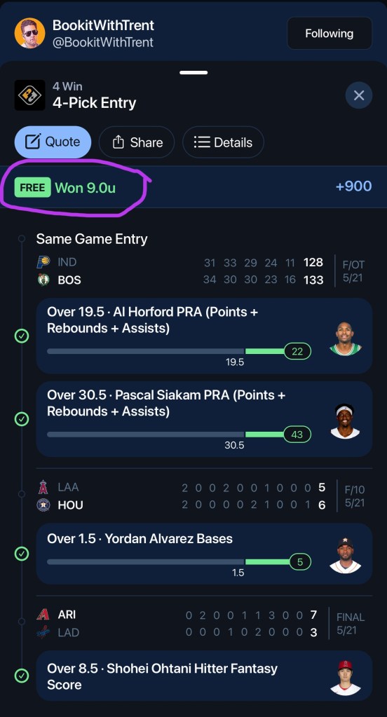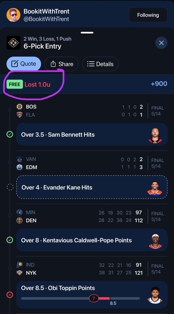 In exchange for making content around their sportsbook and using a code to get people to sign up and deposit on their site, they will create a backend account, with non-withdrawable money so they can “play” and create real slips to post on social media to make it look legit. When in reality, it’s not their real money they are putting on the line. Now Sheff, how can you prove that? Well, there are apps like Pikkit, that record and document all your bets so you can keep track of your wins and losses. Pikkit, being geniuses, can also determine whether the bet came from your account or if it was a “Free” play or bonus play. So if FanDuel gave you a free $20 bet, it knows it was free and didn’t come from your account. So really, all you have to do is look at some of these guys accounts on those apps they are partnered with and it will show you, the 6 leg 10 unit max play they pushed on social media, was really a free play from the sportsbook they work with.